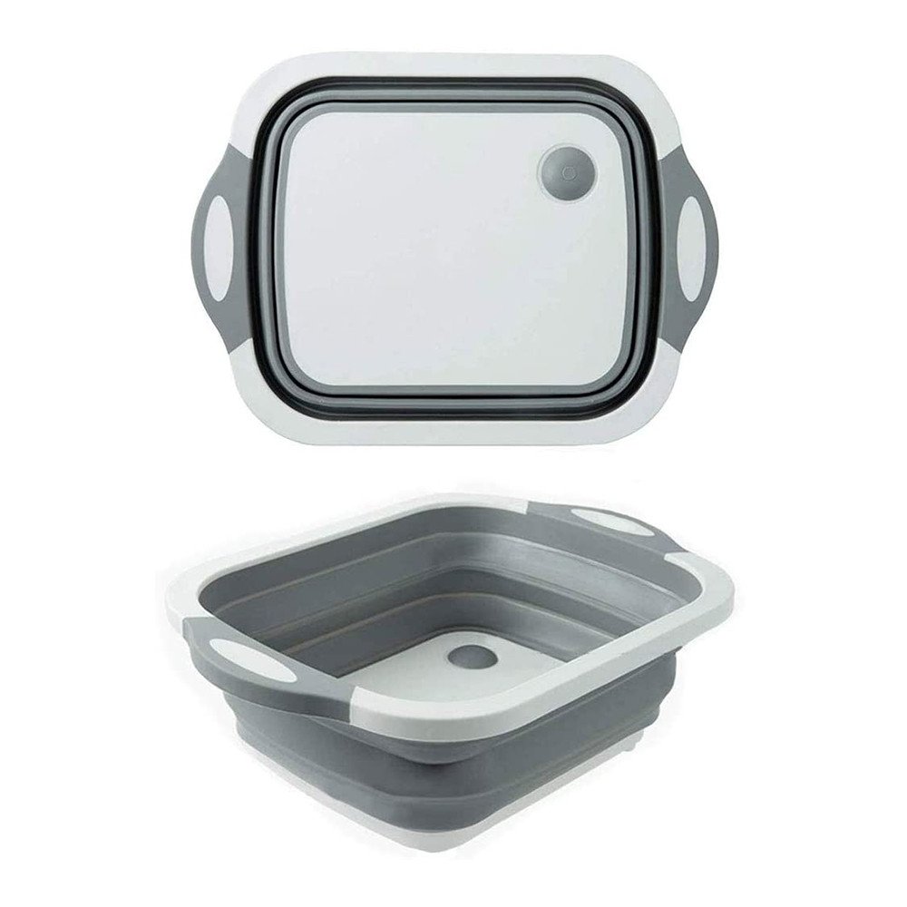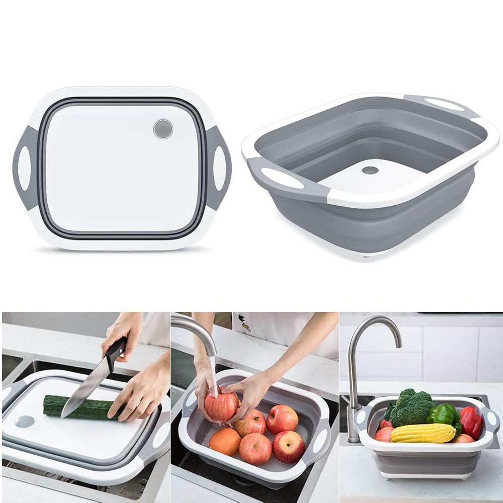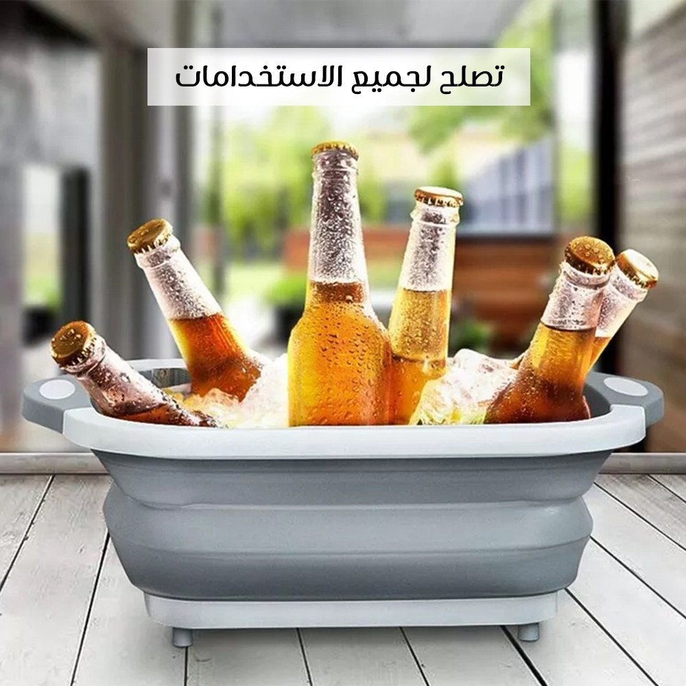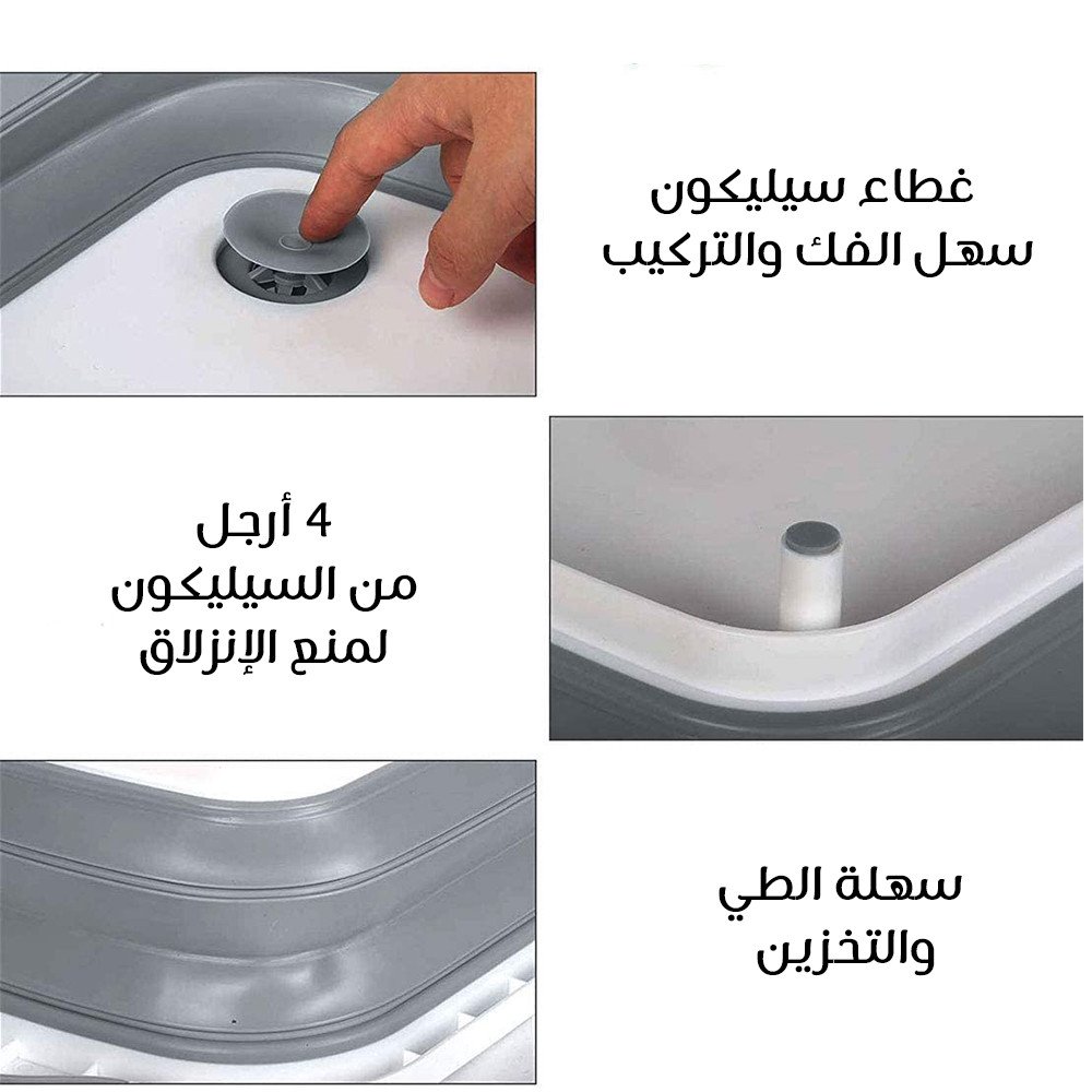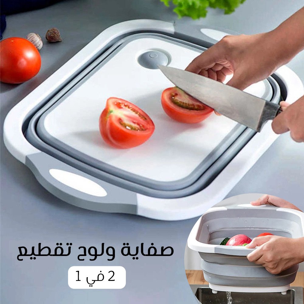 المميزات فيها مكان عشان تصفي المياه و كمان سدادة . ليها 4 قواعد عشان متتحركش أو تقع منك . الخامة من السيليكون سهلة الطي . هتقدري تسخدميها لوح تقطيع و طبق لغسيل الخضروات و اللحوم .