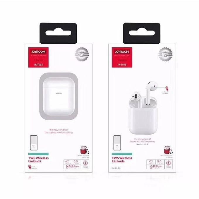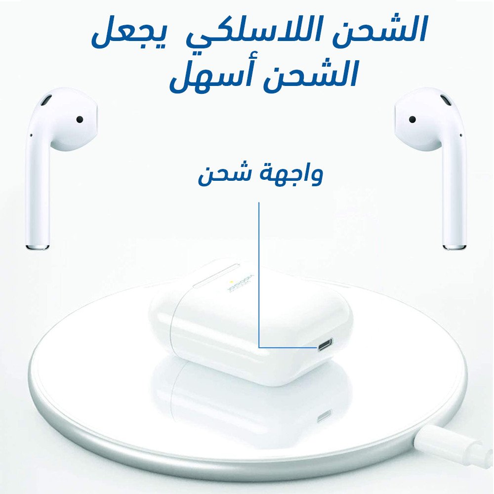 . سماعة لاسلكية للأذن . تحتوي على وصلة شاحن و جراب . 2 ميكروفون في كلا الأذنين . بلوتوث . متوافقة مع جميع أنظمة التشغيل ال اي فون و الأندرويد . بها عازل للصوت . يوجد بها سينسور تاتش . تعمل السماعة لمدة 5 ساعات . الموديل JR - TO3S . بوكس السماعة بيشحن وايرليس . وكس السماعة بيتشحن في ساعة و بيشحن السماعة 4 مرات . تعمل كل سماعة علي حدا . يوجد معاها جراب و ميدالية للنعليق . لون أبيض و جراب أحمر