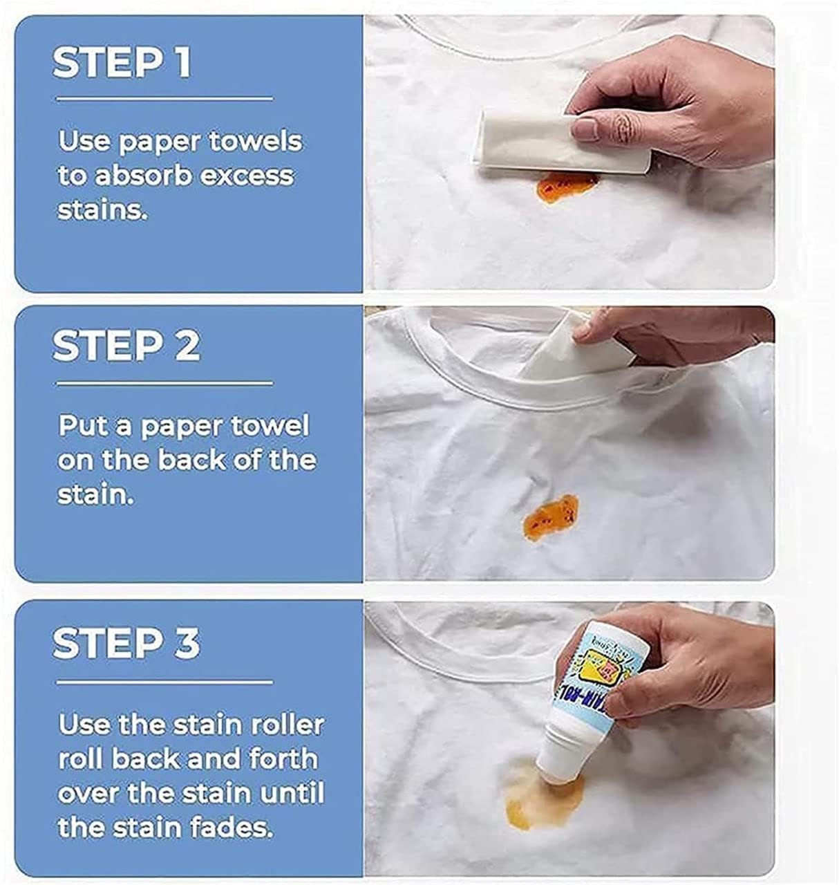 لو برا و هدومك وقع عليها بقعة مش هتتحرج او ترجع البيت في دقيقة واحدة قم باللف للأمام باستخدام مزيل البقع على المنطقة الملطخة ، وستختفي البقعة على الفور دون أن يترك أي أثراً.
