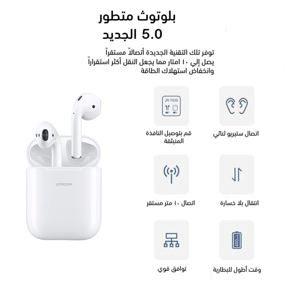 . سماعة لاسلكية للأذن . تحتوي على وصلة شاحن و جراب . 2 ميكروفون في كلا الأذنين . بلوتوث . متوافقة مع جميع أنظمة التشغيل ال اي فون و الأندرويد . بها عازل للصوت . يوجد بها سينسور تاتش . تعمل السماعة لمدة 5 ساعات . الموديل JR - TO3S . بوكس السماعة بيشحن وايرليس . وكس السماعة بيتشحن في ساعة و بيشحن السماعة 4 مرات . تعمل كل سماعة علي حدا . يوجد معاها جراب و ميدالية للنعليق . لون أبيض و جراب أحمر