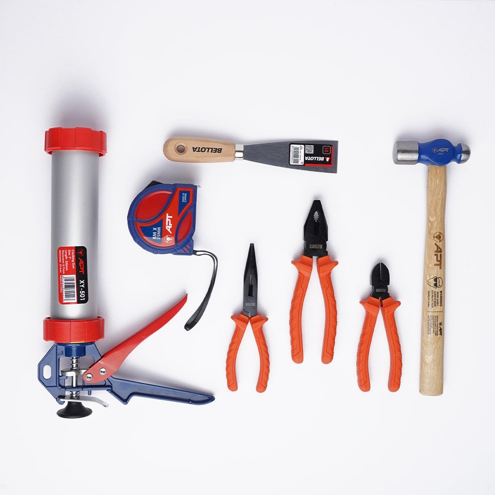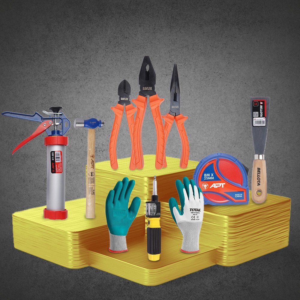 مجموعة أدوات الصيانة لكل بيت (ذرادية عازلة 8 بوصة+قصافة جانبية 6 بوصة+بنسة تليفون 7 بوصة+متر معدن 8 متر+شاكوش بيضة يد خشب+سكينة معجون 40 مم+مسدس سيلكون 9 بوصة+جوانتي ضد القطع TOTAL + مفك مالتي السحري6